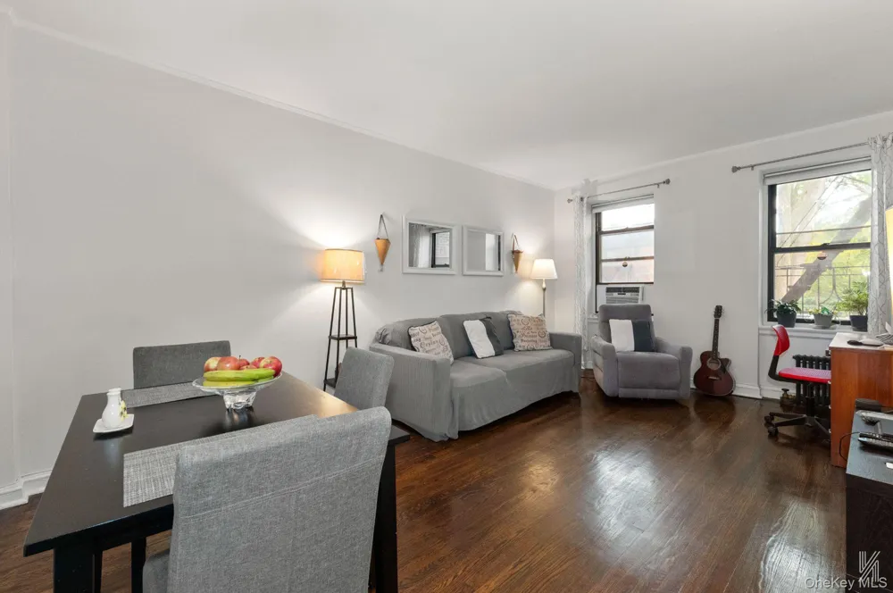 Located in Astoria Heights, this impressive second-floor unit features clean white walls and subtly arched entryways. With hardwood floors throughout, the space feels cohesive and inviting. Upon entering the condo, you'll notice a beautiful built-in bookshelf and a large closet in the foyer—ideal for coats, shoes, and other belongings. Additionally, there is another closet in the hallway near the bathroom, ensuring that storage is never an issue. The living room and dining area boast two west-facing windows, allowing for ample natural light. This expansive space is perfect for entertaining and can accommodate various furniture layouts. The dining area comfortably fits a table for four. The windowed kitchen features a gas stove with five burners and a microwave above it. Clean, white cabinetry provides ample storage above and below the quartz countertops, while the grey subway-tile backsplash and stainless-steel appliances add a modern touch. In the bedroom, oversized dual-pane windows fill the room with light, and a modern ceiling fan provides airflow. The space is large enough to fit a queen-sized bed and a large bureau. The windowed bathroom showcases a glass-enclosed shower/tub combo with white tiles and a grey tile accent. Dark wood cabinets under the sink offer additional storage. Garden Bay Manor is a condo complex that spans several square blocks in the highly desirable Upper Ditmars/Astoria Heights neighborhood. It is known for its well-manicured landscaping and low common charges and annual real estate taxes. Street parking is abundant, and a variety of transportation options are nearby, including the M60, Q100, and Q69 buses. Shops, cafes, restaurants, and LaGuardia Airport are just minutes away.